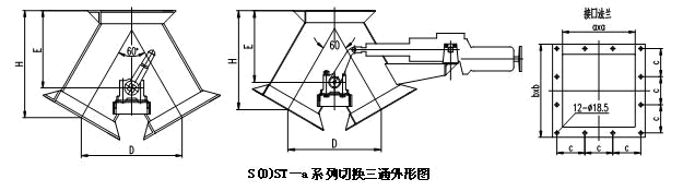 TS型手动切换三通结构参数表: | 型号 | GCTS-250 | GCTS-300 | GCTS-400 | GCTS-500 | a×a(mm) | 250×250 | 300×300 | 400×400 | 500×500 | b×b(mm) | 350×350 | 426×426 | 526×526 | 626×626 | c(mm) | 104 | 121 | 154 | 187 | D(mm) | 477 | 538 | 670 | 780 | E(mm) | 330 | 373 | 498 | 601 | H(mm) | 513 | 559 | 699 | 797 | TS型电动切换三通结构参数表: 型号 | GCTS-250 | GCTS-300 | GCTS-400 | GCTS-500 | a×a(mm) | 250×250 | 300×300 | 400×400 | 500×500 | b×b(mm) | 350×350 | 426×426 | 526×526 | 626×626 | c(mm) | 104 | 121 | 154 | 187 | D(mm) | 477 | 538 | 670 | 780 | E(mm) | 330 | 373 | 498 | 601 | H(mm) | 513 | 559 | 699 | 797 | 电机功率(kW) | 0.37 | 0.37 | 0.37 | 0.55 | 推杆速度(mm/s) | 80 | 80 | 80 | | |