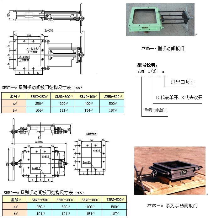 SBMD(S)—a系列手动闸板门是在输送飞灰和粉粒状干物料的系统中用于截止调节输送物料的装置,可安装在火力发电厂的省煤器、空气预热器、干式除尘器、烟道等灰斗、灰库、渣库下部,工作温度允许达到250℃。