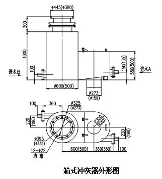 用途: 箱式冲灰器是用于电除尘器灰斗下或锅炉房省煤器灰斗下的除尘冲灰设备。 结构特点: 本公司根据用户意见和电厂运行的实际情况而设计的。具有搅拌效果好,水灰比在3-4的范围内变化,比老式的箱式冲灰器节省水量约20%。 选用须知: 1、选用时应根据所需配置不同直径喷嘴,喷嘴接管为2”水煤气管。 2、GCCH-II型箱式冲灰器出率在5t/h以下。 3、在某些环境中已选用I型箱式冲灰器,为了减少耗水量,可关闭B侧喷嘴,使用A侧喷嘴。 4、当水压为0.5Mpa、0.6Mpa时水灰比小于3建议选用CH-I型箱式冲灰器。 5、订货时请选定喷嘴直径,对进口安装法兰如有特殊要求请注明。 箱式冲灰器外形图中II型箱式冲灰器尺寸为括号外的,I型箱式冲灰器尺寸为括号内的。