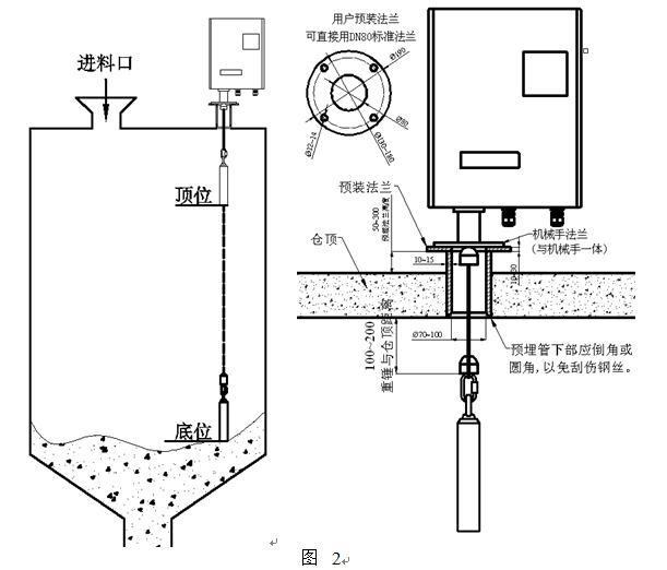 (1) 智能物位仪的安装位置必须在进料口的背风侧或远离进出料口(一般不小于 2.5m。如进料口的风速 较大时,则离进料口的距离应不小于 4m),特别要防止进料对重锤的冲刷而导致智能物位仪不能正常工作的 情况出现。