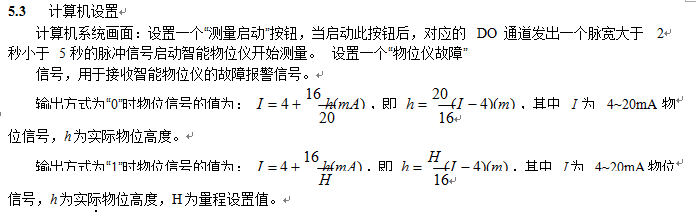 I = 4 + 16 H (mA) 。这种输出方式的特点是计算机显示(如 PLC 或 DCS)设置时,统一为 4~20mA 对应 0~20
