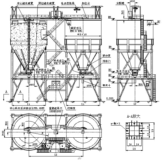 用途: 在燃煤电厂,脱水仓将来自炉底的渣浆和炉后灰浆进行脱水至含水率低于30%,并装车外运,其原理与过程是:灰渣浆从脱水仓上口近中心处连续注入仓体内,灰渣慢慢向下沉降,上部较清的灰水从脱水仓上口周边锯齿形溢流堰溢出,并流入相配套高效浓缩机,或沉淀池及蓄水池而逐步澄清。澄清后的水仍作灰渣冷却和水力输送用水,实现了除灰水循环利用。高效浓缩机、沉淀池、蓄水池浓缩后的灰浆仍泵回脱水仓。脱水仓内沉积的灰渣料位达到额定高度后,便停止灰浆注入,然后再经4~8小时沉静滤水,使灰渣含水率低于30%,最后开动底部排灰闸门将脱水后的灰渣放出并装车外运。 结构特点: 灰渣浆从仓体上口近中心处注入缓冲盘,缓冲盘中心是衬有铸石的缓冲杯,周围是多孔圆盘,灰浆先经缓冲杯缓冲,再经多孔圆盘疏散而漫入仓内,使激流的渣浆得到充分缓冲,有利于灰渣沉淀而降低溢流水含灰量。 中心滤水装置是由若干节滤心上下摞装而成相接处不加螺栓紧固,以便用专用锚爪从上口逐节装入和提出,因此更换滤心方便;三角垅式周边滤水元件也因采取插装而更换极易。 技术特点: TC型脱水仓是我公司在引进、消化国外技术的基础上,经数年实践总结而设计的新型脱水设备,主要结构特点: 1、 脱水仓周边滤水装置以三棱形不锈钢滤水板型式取代原槽形滤水板结构,与仓壁的固定结构由原先的焊接改变为上吊下撑的销式连接结构,实现了无螺栓连接。拆装方便快捷。同时,滤水板与仓壁夹角增大,减轻了仓壁挂渣的现象。 2、 脱水仓中心滤水装置采用吊笼式不锈钢滤芯摞装结构,实现了无螺栓连接。滤芯清洗或酸洗后即可再生。大大延长了滤芯使用寿命。更换或检修滤芯时,可通过仓顶的滤芯吊装专用锚抓将滤芯从仓中吊出或放入,检修方便快捷。同时,由于检修人员不必进入仓内工作,大大减轻了滤芯更换的危险程度。 3、 脱水仓选用“四螺杆悬吊四轮式排渣门”。调节渣门与排渣口间隙方便,克服了传统脱水仓曲柄托轮式排渣门门缝间隙调节困难的弊端。此排渣门配有开度指示装置,在控制室即可了解排渣门的开启程度,这一点对现场操作者来说,是非常必要的。 4、 脱水仓排渣门密封程度是脱水仓产品性能的重要指标之一。脱水仓采用T型密封圈结构,压兰固定方式。自密封结构气嘴,密封圈内压的增加,不但不会造成密封圈气嘴的脱出和气体的泄漏,并随气压的增加密封性能并进一步增强。压兰固定克服密封圈在设备运行时容易脱落的弊端。V型密封圈虽然采用压兰固定方式,但由于V型密封圈不是密封空腔结构,容易造成漏气现象。而元宝型密封圈虽然采用密封孔腔结构,但气嘴采用O型圈密封,极易造成漏气现象,同时由于采用嵌装式结构,密封圈容易脱落。 5、 排渣门采用电动操作,手动备用的可靠控制。在电动控制出现故障或脱水仓控制室失去电源的情况下采用手动控制,确保任何情况下,都可开关排渣门。渣门开关与密封圈充放气实行互锁控制: 6、 渣门未完全关闭时,密封圈充不上气,防止密封圈打炮破裂; 7、 渣门开关动作时,密封圈被负压吸瘪,防止密封圈被渣门擦伤,从而保证了其长寿命。 8、 缓冲盘是进浆口处衬有铸石的多孔圆盘,激流的灰渣浆进入缓冲盘后得以缓冲后,再经多孔圆盘疏散,漫流入仓,尽可能降低渣浆对仓内已沉积灰渣的扰动,使溢流水的水质进一步得以提高。
