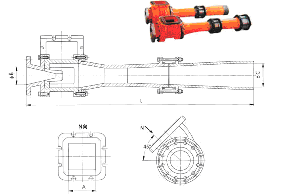 用途: SPQ系列水力喷射器是根据国外先进技术及国内电厂的运行经验设计制造的,用于火力发电厂锅炉底渣、 石子煤、飞灰等短程输送,也适用于矿山、化工、冶金等部门含固体浆粒的浆体,输送动力来自工作喷嘴的高压水,高压水经过喷嘴在混合室产生负压,将渣水混合物吸入混合室与之混合,并转换成动能排入管道。 结构特点: 该设备具有能量损失小、工作效率高的特点,易损件采用耐磨材料,使用寿命长;设计时可根据用户除渣系统出力和管道阻力等条件,选择相应的喷嘴直径和喷射水压;设备最大处理干料能力为40t/h. 主要尺寸及技术参数: | 参数 型号 | SPQ75x100 | SPQ150x200 | SPQ200x200 | 进料口尺寸 A mm | Φ75 | 152x152 | 203x203 | 进水口尺寸 ΦB mm | 102 | 152 | 152 | 出口尺寸 ΦC mm | 150 | 197 | 197 | 最高供水压力 MPa | 2.45 | 2.45 | 2.45 | 设备总长 mm | 927 | 1562 | 1860 | 安装注意事项: (1)安装法兰接口要保证法兰接合面的平整,并涂以密封胶,以保证不出现漏灰、漏水、漏浆现象。 (2)水力喷射器的铸件切忌敲打。 供货范围: 整台供货。
