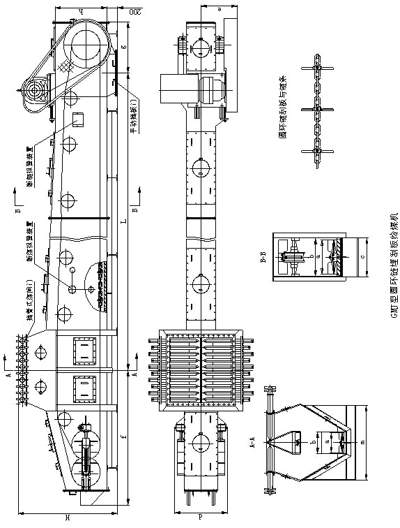 用途: GMJ型埋刮板给煤机广泛用于燃煤电厂的给煤系统,其结构合理,质量优良,维护量少,寿命长,深受广大用户信赖。 结构特点 1. 尾部张紧装置采用手动蜗轮蜗杆机构,只需摇动一端,两端同步张紧。解决了因两侧张紧不同步,导致尾轮轴偏斜的弊病。 2. 回程链条刮板在托轮上运行。变通常的托轨承托为托轮承托,动力消耗小,刮板链条磨损大大减轻。链条在各托轮之间自由下垂实现自动张紧,保证设备在链条较长的情况下仍能正常运行。 3. 进料口采用分流式结构。使回程链条及刮板与进煤隔离,进煤以大尺寸通道长驱直入,并以不变的大尺寸煤层厚度向前输送;卸料口采用开阔式结构,杜绝了通常被“大三块”卡死给煤机事故的发生。 4. 采用背负式驱动机构,背负驱动机构受力好,节省空间,安装检修方便。 5. 在壳槽底部衬有玄武岩铸石,不仅比金属衬底寿命提高4~5倍,且比金属衬底摩擦阻力小,从而降低了刮板和链条的磨损。 6. 拖动链轮采用凹齿型,它比凸齿型链轮对国产圆环链条有更强的适应性。在链条严重磨损而周节加大后仍不掉链,从而大大延长了链条的更换周期。 7. 给煤机设有断煤报警、断链、堵煤检测等装置。可以及时发现进煤阻断故障或断链事故。自动停机并发出报警信号。 8. 给煤机设有过载保护装置,当链条过载时,自动停机并发出报警信号。 9. 给煤机有两种调速方式供用户选择:电磁调速与变频调速。具有效率高、调速范围广、精度高、调速平滑等特点。 10. 可根据用户要求,加设给煤计量装置,而且有数码显示,提供准确给煤量。 11.机壳内无死角,不积料、不堵料、不粘结。