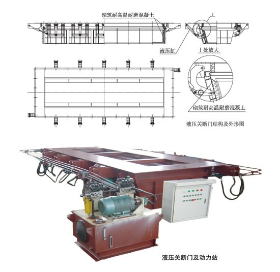 用途: 液压关断门安装在渣井下部,其主要功能是在炉底除渣设备出现故障时,关闭关断门,通过渣井的有效储渣容积来临时储存炉底渣,避免因炉底设备故障出现不得不停炉的事故。在有限时间内,对除渣设备进行临时抢修。